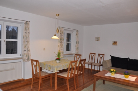 In der Wohnküche ist eine Couchgarnitur, ein Essbereich und die Küchenzeile.