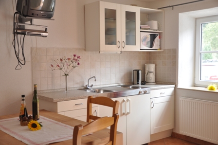 Die Küchenzeile ist mit einem Glaskeramikkochfeld und Backrohr, Kühlschrank, Spülmaschine und Mikrowelle mit Grill ausgestattet.